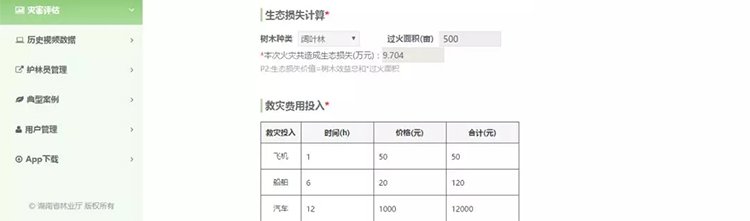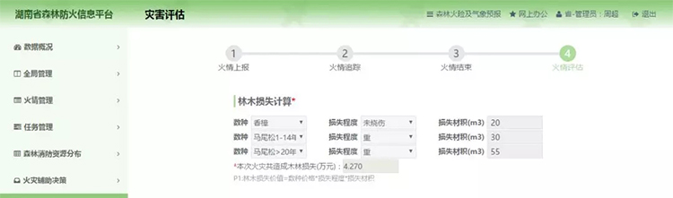 此外在灾情结束后,指挥中心根据森林消防人员传输回来的树木种类、过火面积、材积损失等数据,会在系统内自动生成数学模型,直接算出林木损失、生态损失、经费投入等因灾损失数据,进行灾情评估。