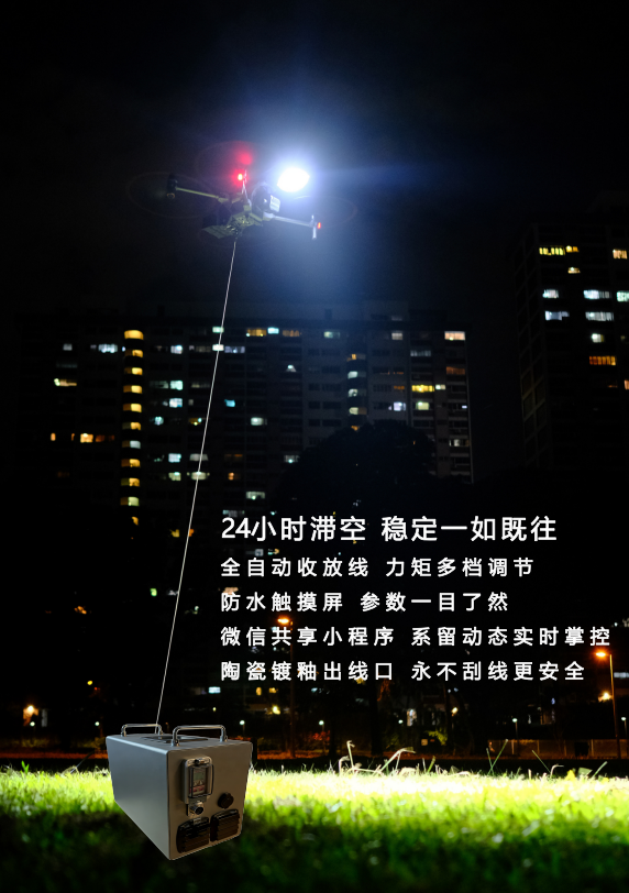 该款系留⽆⼈机凭借轻巧的机⾝设计、强⼤的抗⻛能⼒、稳定的航电系统⽽⼴受 好评,折叠式的机⾝使得在各种作业环境中都能迅速响应即刻⻜⾏。系统具备⼤功率 系留供电装置,可⽤于⻓时间滞空持续监控和照明作业。宽压的设计适合多种场景下 持续运⾏,保障设备在应急条件下的快速部署和使⽤。系统具备电缆全⾃动收放、⼒ 矩可调、电压电流实时显示。系留地⾯站和⽆⼈机可⼀体化收纳在三防箱内便于单⼈ 携带和运输。