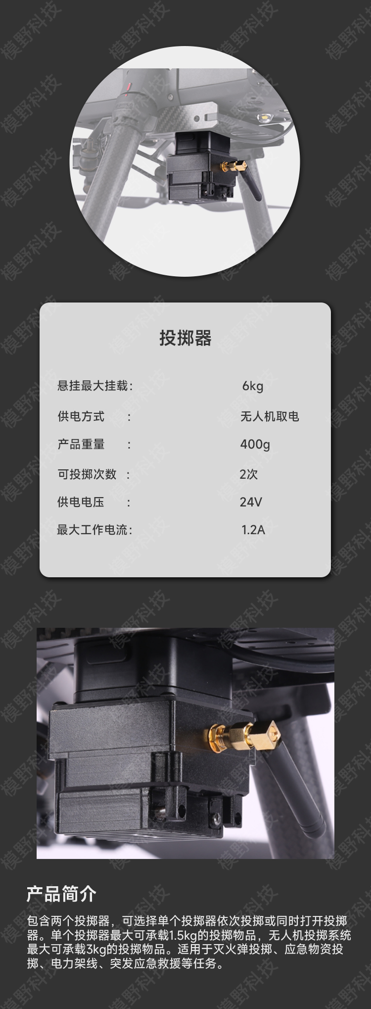 包含两个投掷器,可选择单个投掷器依次投掷或同时打开投掷器。单个投掷器最大可承载1.5kg的投掷物品,无人机投掷系统最大可承载3kg的投掷物品。适用于灭火弹投掷、应急物资投掷、电力架线、突发应急救援等任务。