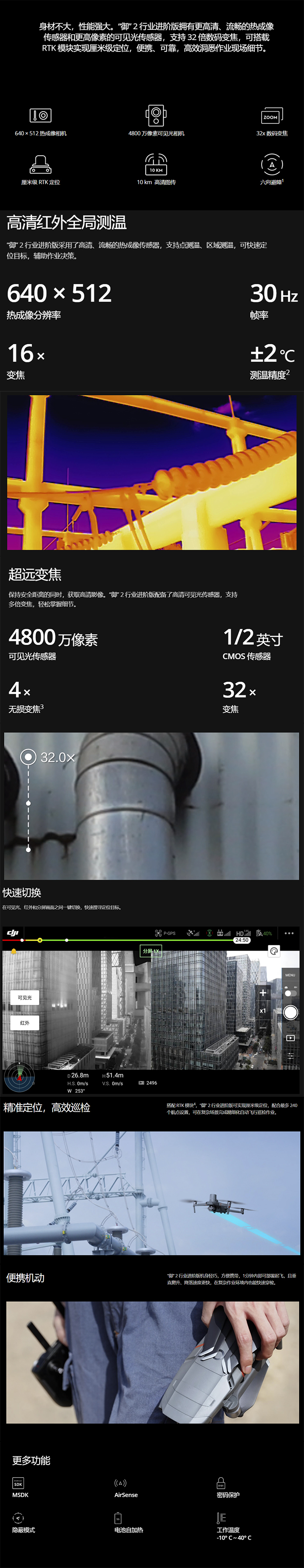 身材不大,性能强大。“御” 2 行业进阶版拥有更高清、流畅的热成像传感器和更高像素的可见光传感器,支持 32 倍数码变焦,可搭载 RTK 模块实现厘米级定位,便携、可靠,高效洞悉作业现场细节。