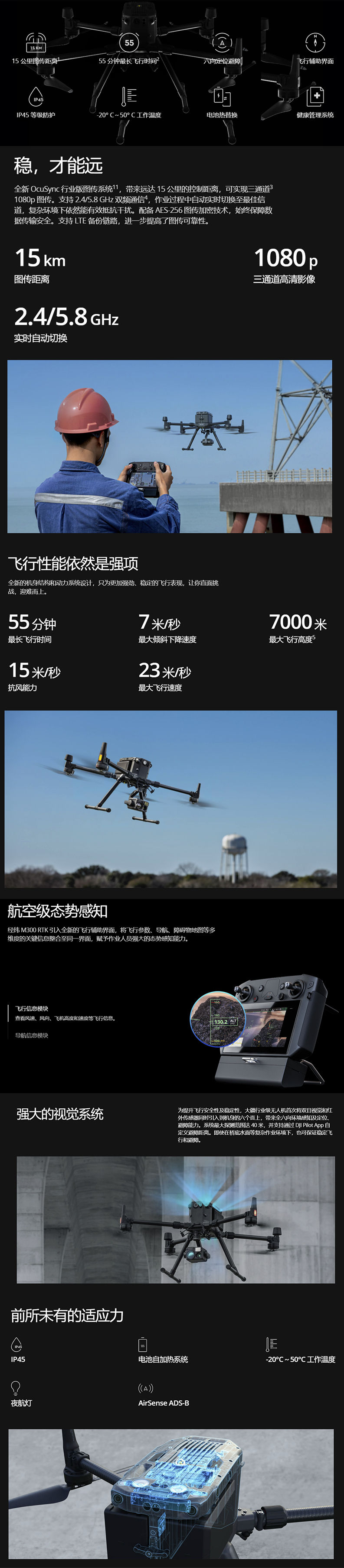 现代航空系统与行业级无人机结合。经纬M300 RTK拥有55分钟长续航,强大的机器智能及六项避障等诸多强项,以实力刷新想象。