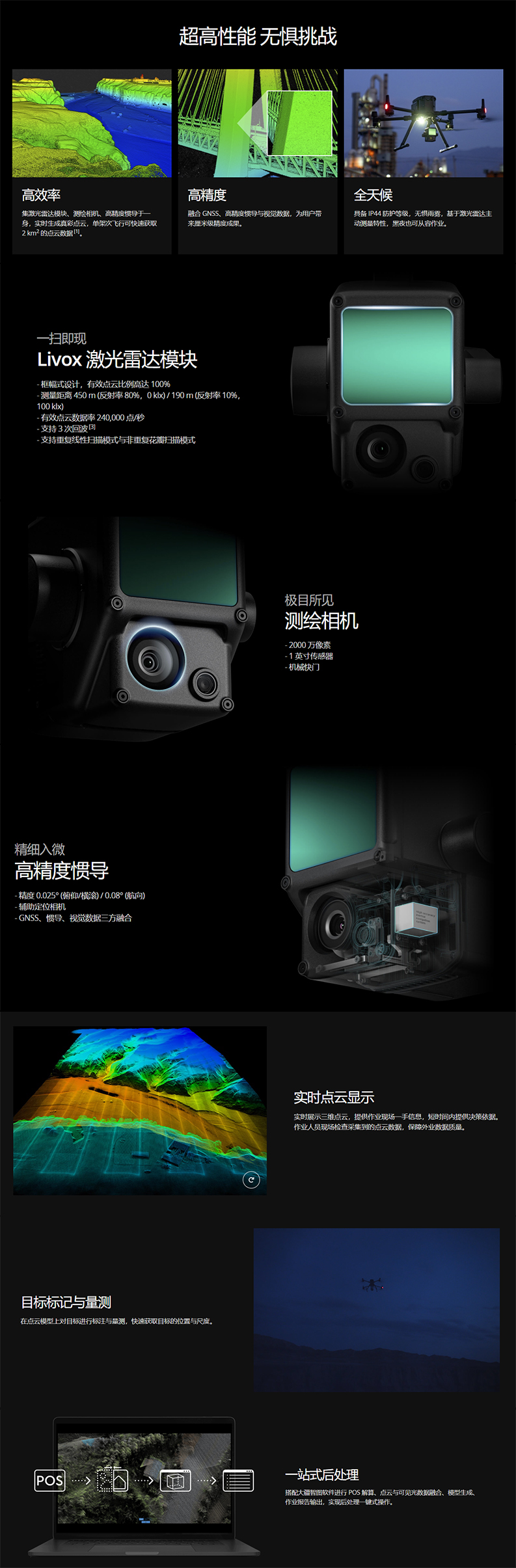 DJI L1 集成 Livox 激光雷达模块、高精度惯导、测绘相机、三轴云台等模块,搭配经纬 M300 RTK 和大疆智图,形成一体化解决方案,轻松实现全天候、高效率实时三维数据获取以及复杂场景下的高精度后处理重建。