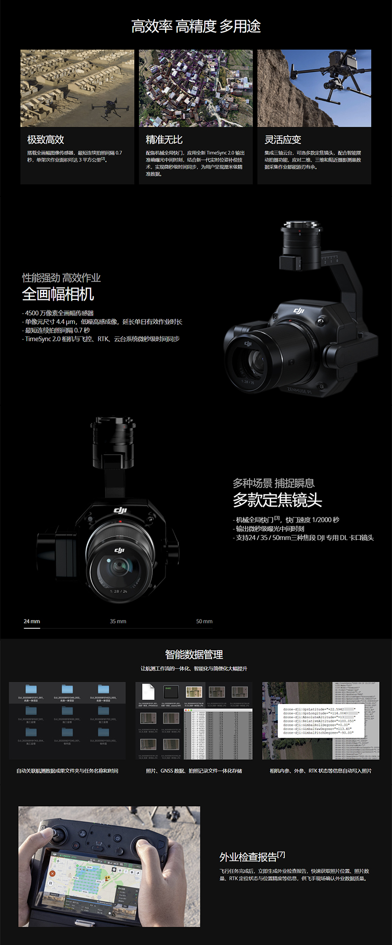 禅思 P1 集成全画幅图像传感器与三轴云台,支持多款定焦镜头,成就高性能、多用途航测负载。搭配经纬 M300 RTK 和大疆智图软件,带来高精度、高效率、一体化的航测解决方案,树立航测领域新标杆。