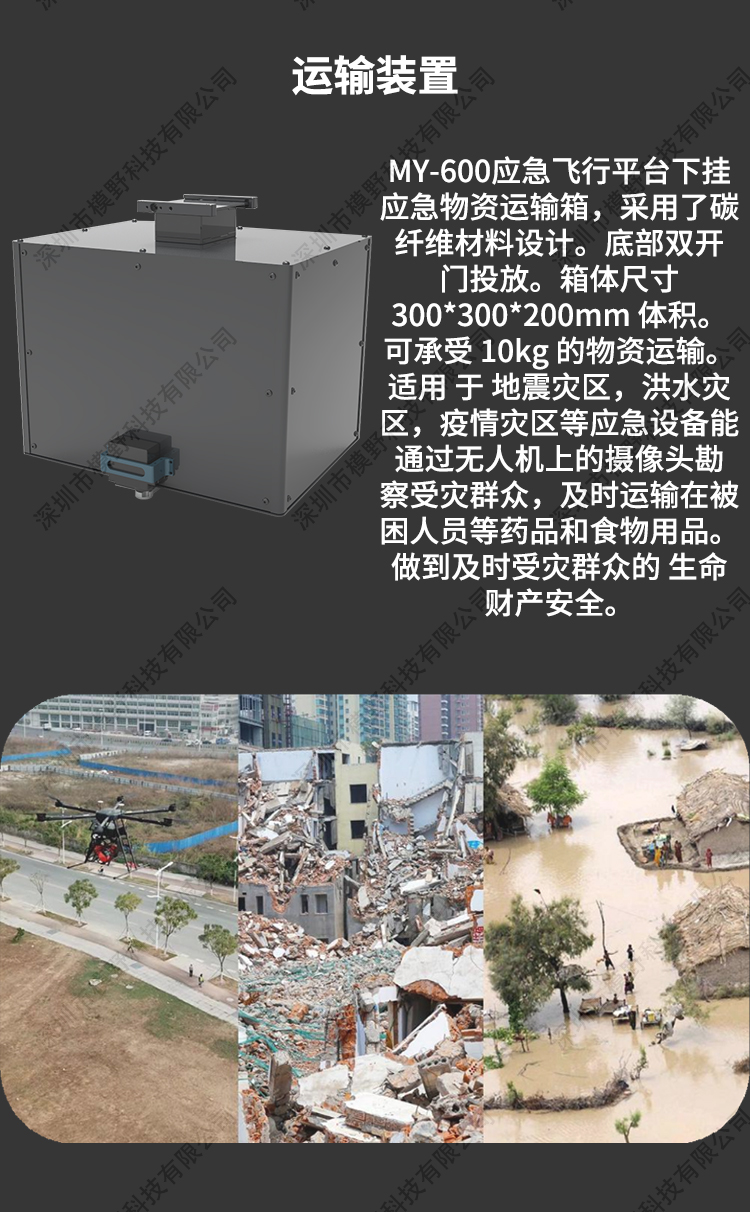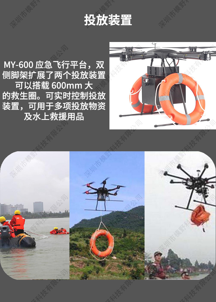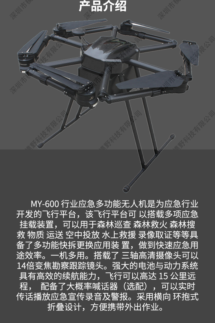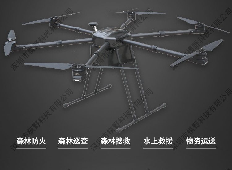 MY-600 行业应急多功能无人机是为应急行业开发的飞行平台,该飞行平台可 以搭载多项应急挂载装置,可以用于森林巡查 森林救火 森林搜救 物质 运送 空中投放 水上救援 录像取证等等。具备了多功能快拆更换应用装 置,做到快速应急用途效率。
