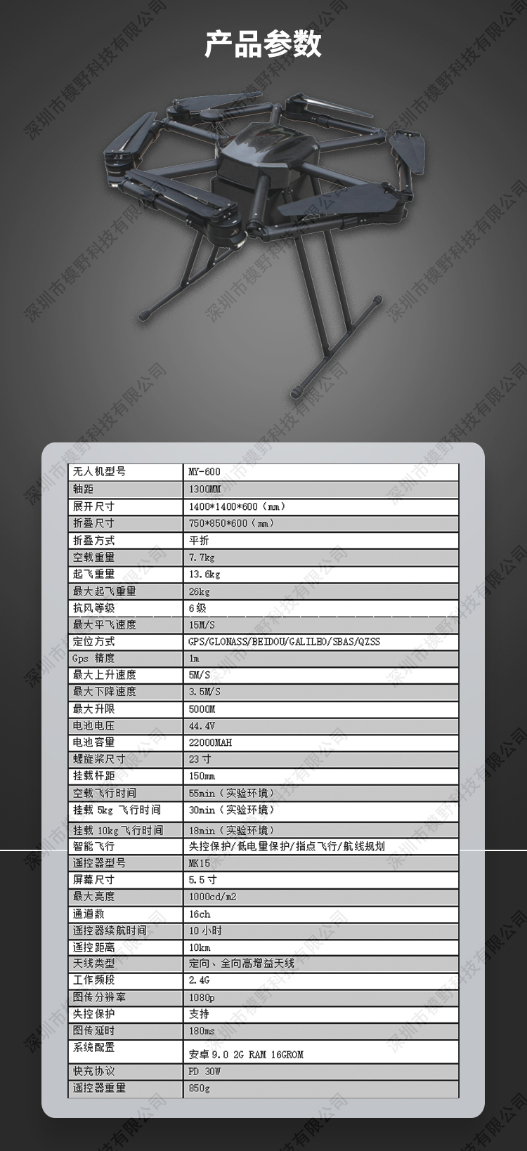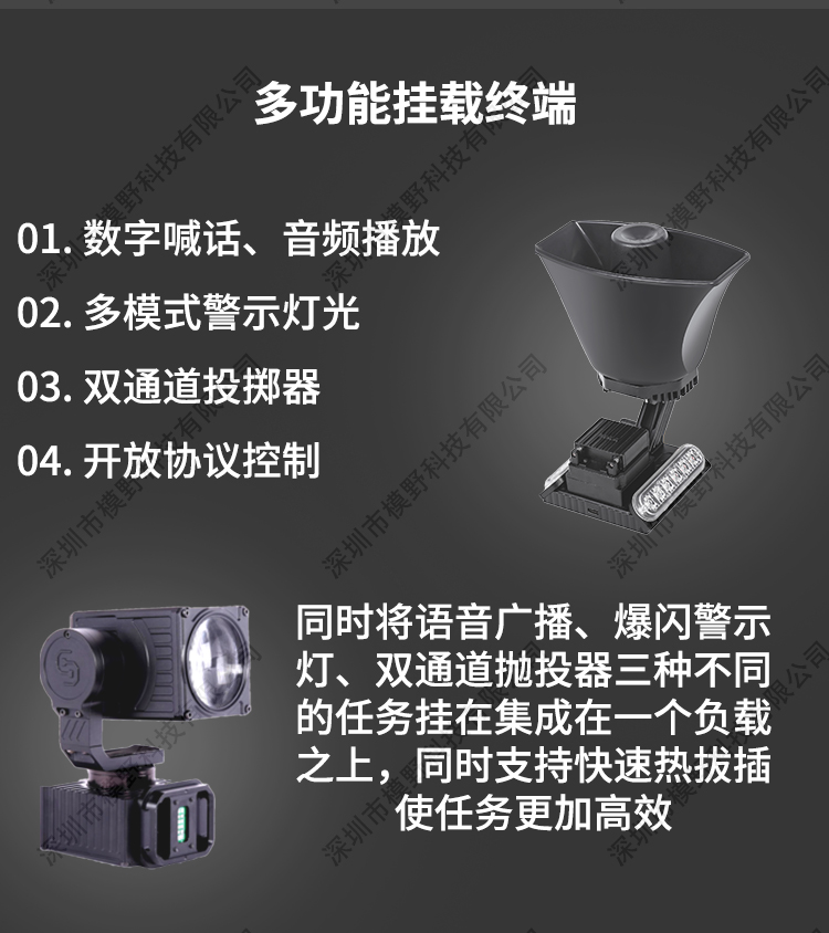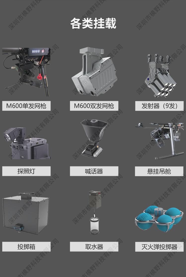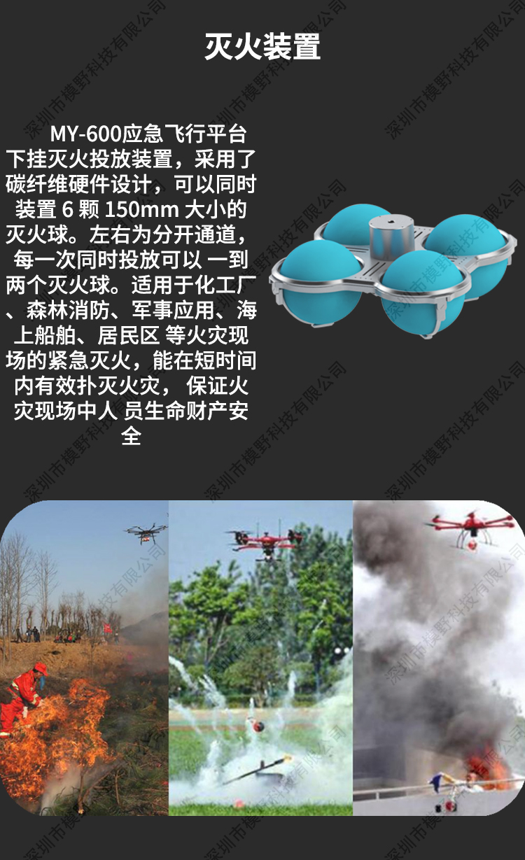 MY-600 行业应急多功能无人机是为应急行业开发的飞行平台,该飞行平台可 以搭载多项应急挂载装置,可以用于森林巡查 森林救火 森林搜救 物质 运送 空中投放 水上救援 录像取证等等。具备了多功能快拆更换应用装 置,做到快速应急用途效率。