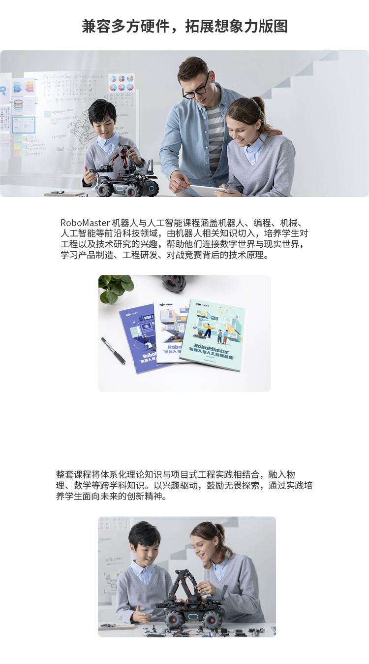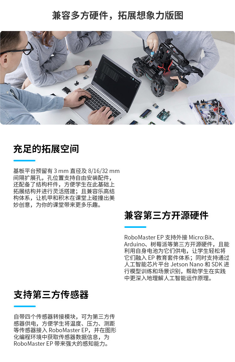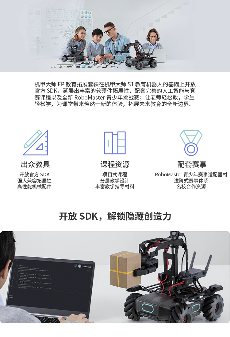 机甲大师 EP 教育拓展套装在机甲大师 S1 教育机器人的基础上开放官方 SDK,延展出丰富的软硬件拓展性,配套完善的人工智能与竞赛课程以及全新 RoboMaster 青少年挑战赛;让老师轻松教,学生轻松学,为课堂带来焕然一新的体验,拓展未来教育的全新边界。