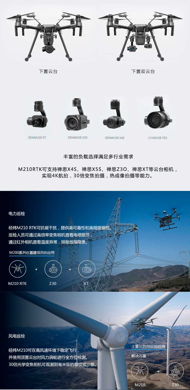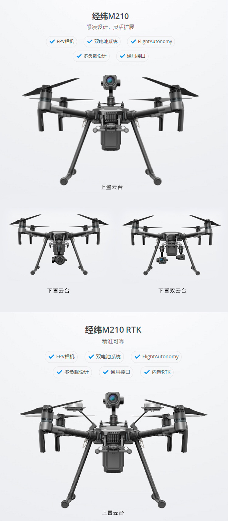 大疆经纬M200系列有三种型号:M200、M210和M210 RTK。可以搭载普通可见光相机、变焦相机Z30以及红外热成像相机XT/XT2等等。