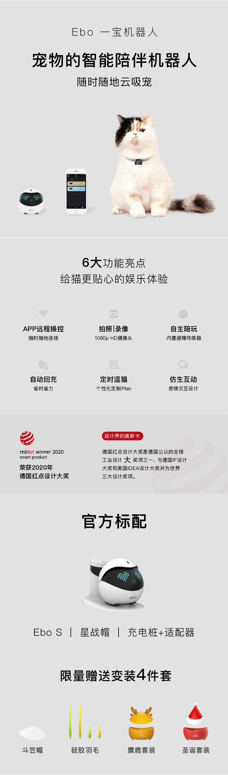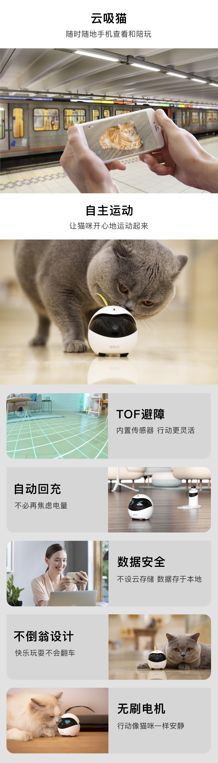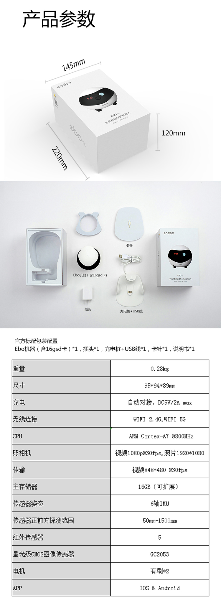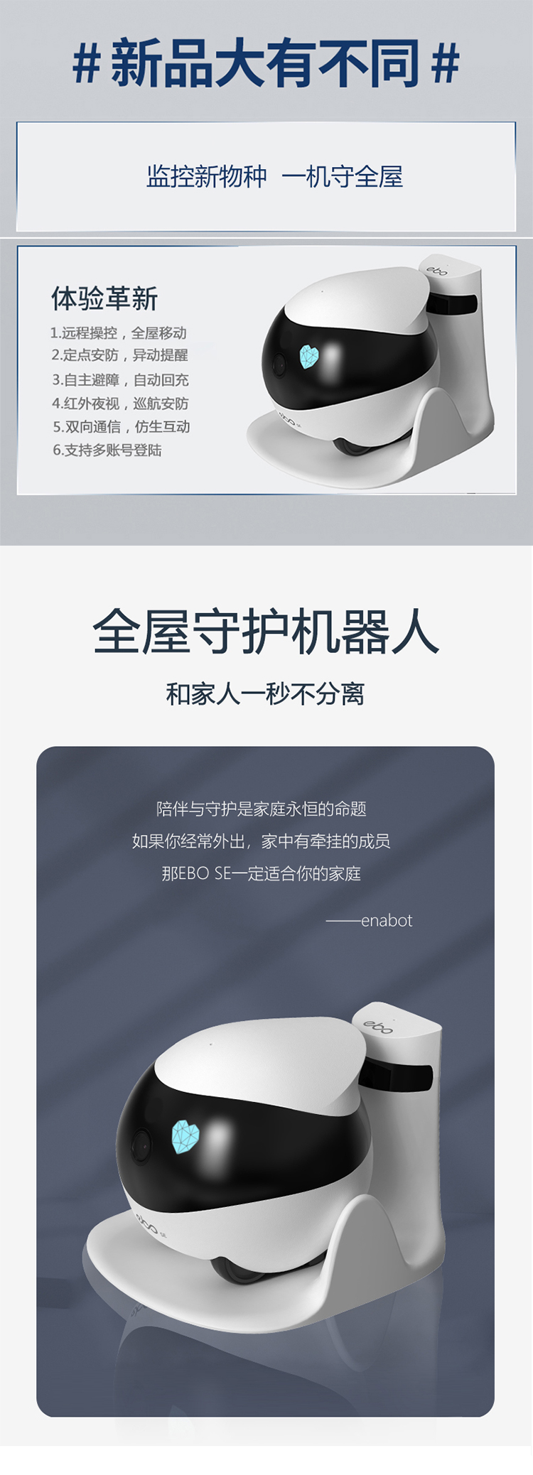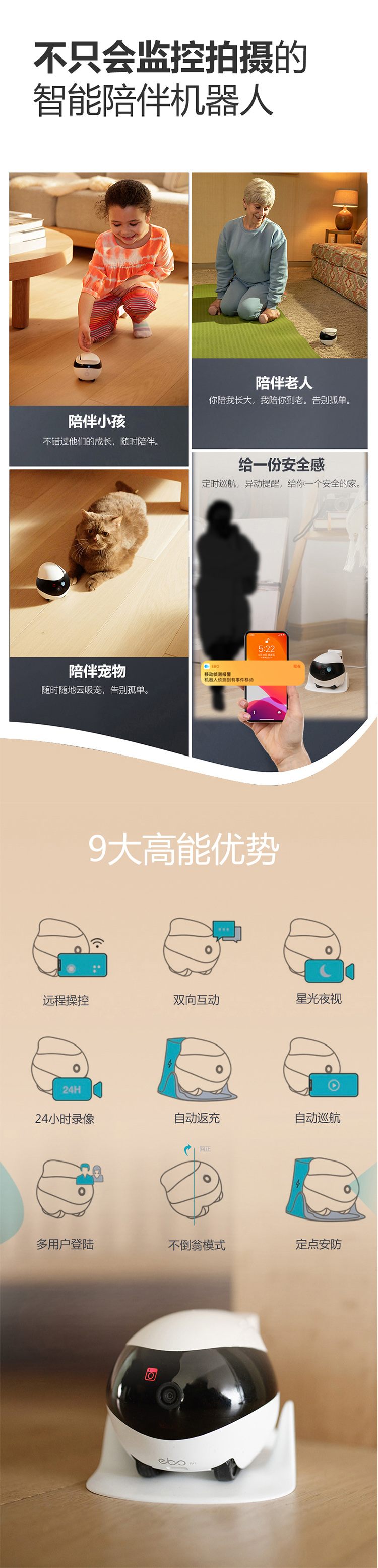 全屋守护机器人和家人一秒不分离,不止会监控拍摄的智能陪伴机器人,随时随地,关心家人EBO作为一个可以全屋移动的家庭守护机器人,拥有实时监控的功能,支持回查和多账号登陆,摆脱了充电线的限制,能够到达家的每一个角落,不再有监控死角