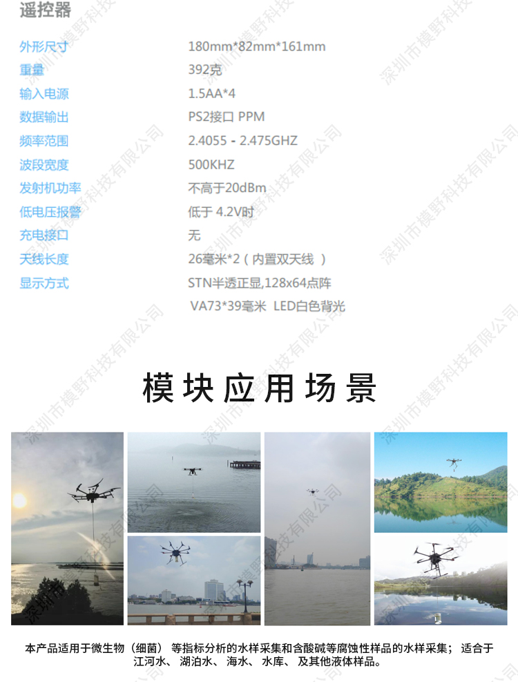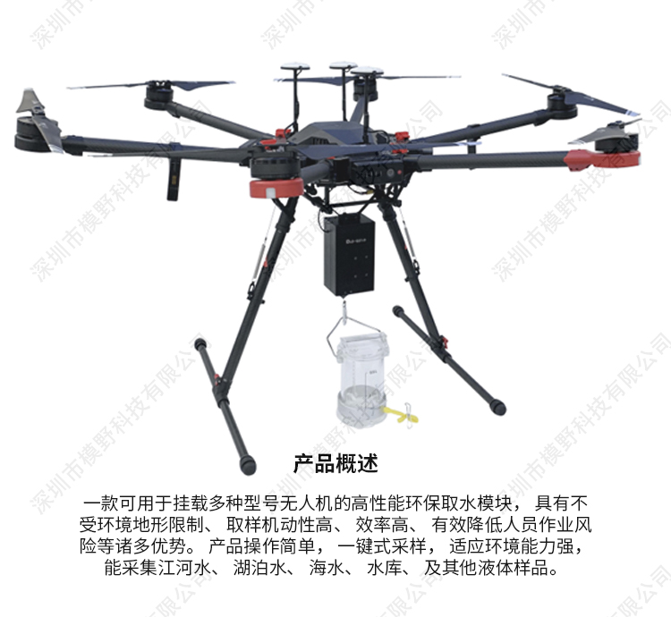 一款可用于挂载多种型号无人机的高性能环保取水模块。 产品操作简单, 一键式采样, 适应环境能力强,能采集江河水、 湖泊水、 海水、 水库、 及其他液体样品。