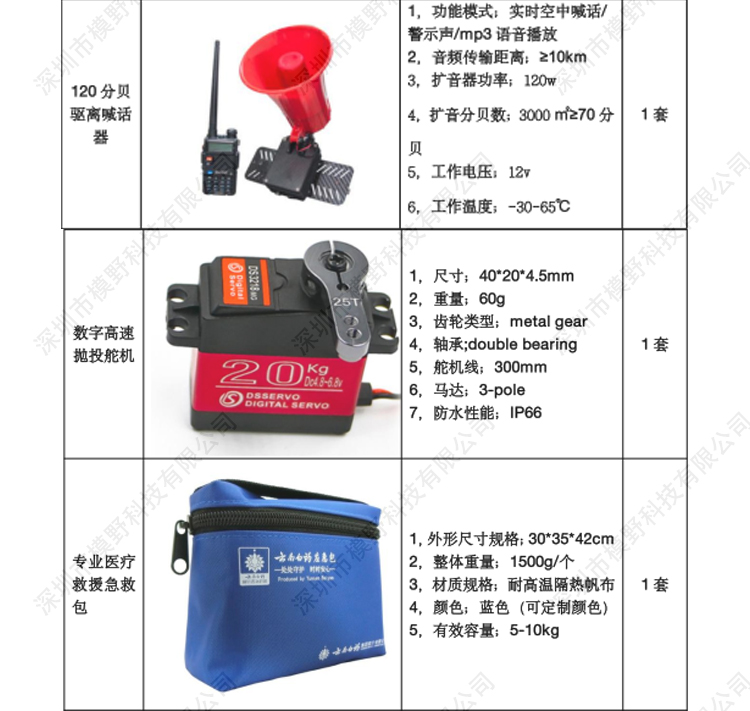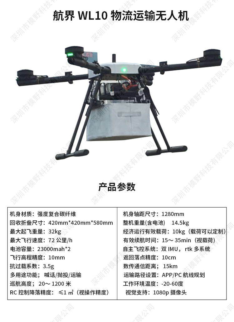 采用高强度复合碳钎维材质,最大起飞重量高达32kg,可用喊话/抛投/运输,有效续航时间15~35min