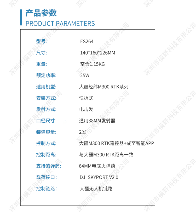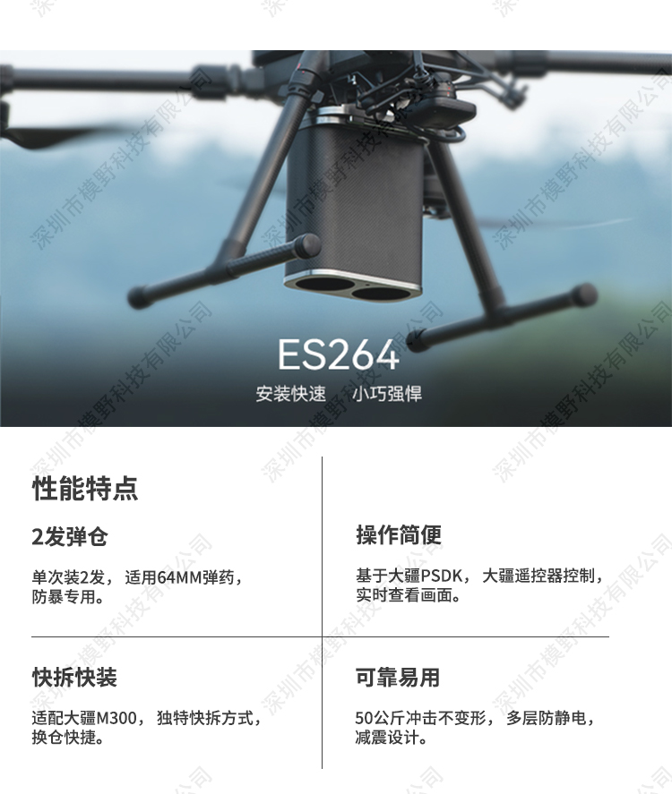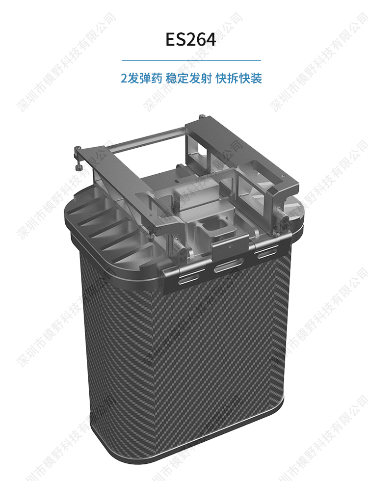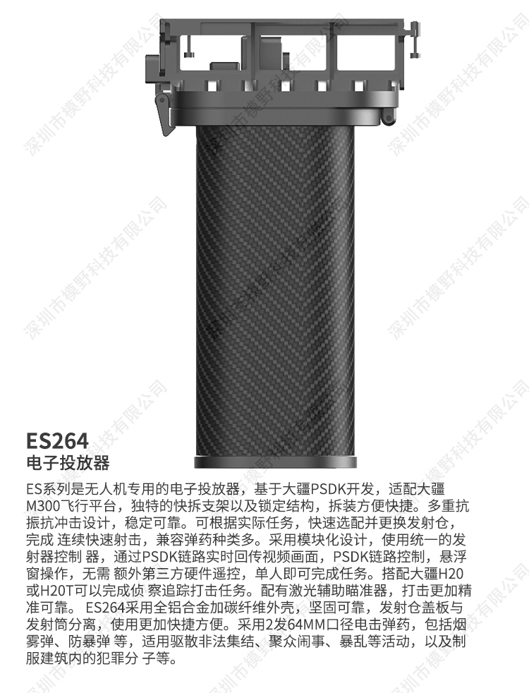 ES系列是无人机专用的电子投放器,搭配大疆H20或H20T可以完成侦 察追踪打击任务。配有激光辅助瞄准器,打击更加精准可靠。 ES264采用全铝合金加碳纤维外壳,坚固可靠,发射仓盖板与发射筒分离,使用更加快捷方便。采用2发64mm口径电击弹药。