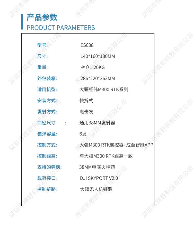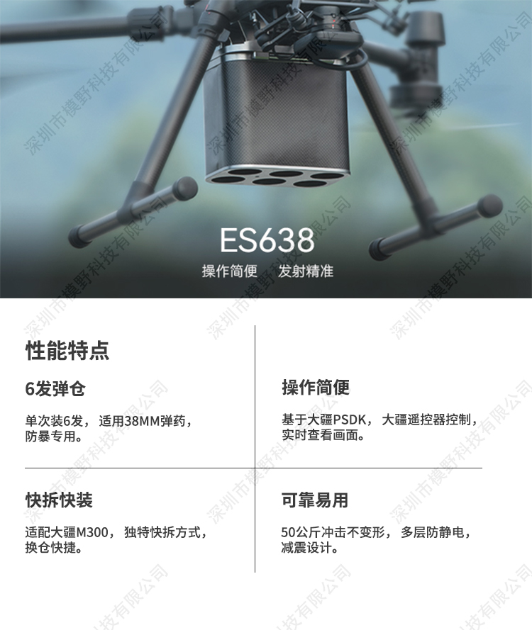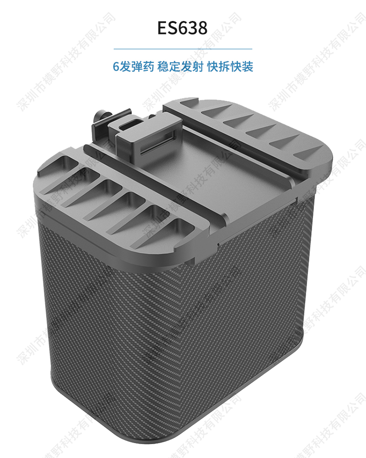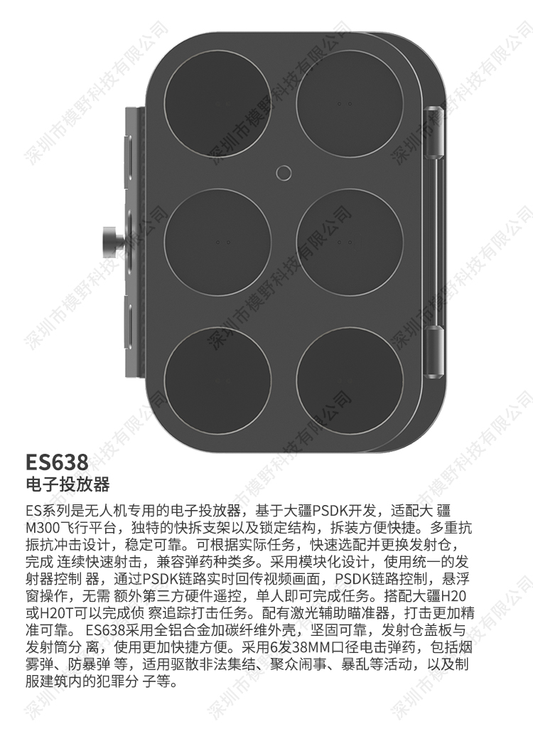 ES系列是无人机专用的电子投放器,拆装方便快捷,多重抗 振抗冲击设计,稳定可靠。 ES638采用全铝合金加碳纤维外壳,坚固可靠,发射仓盖板与发射筒分 离,使用更加快捷方便。采用6发38mm口径电击弹药