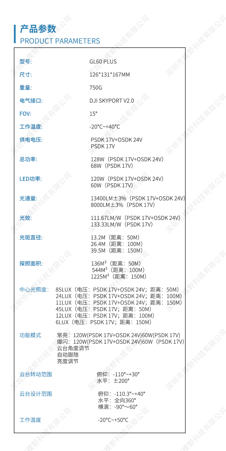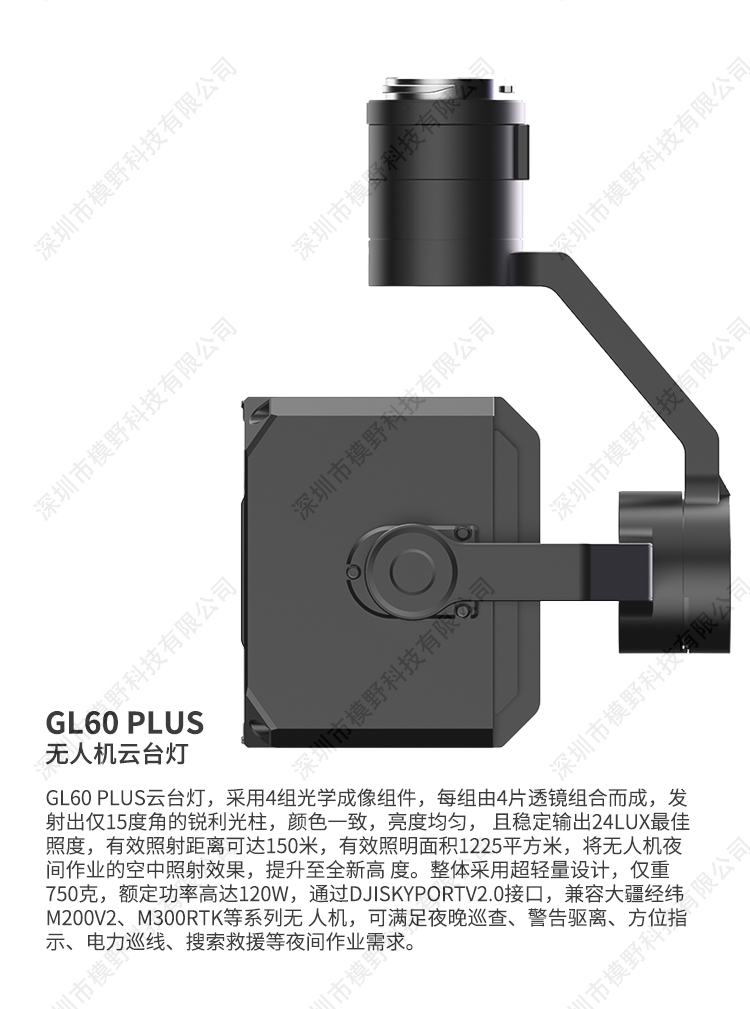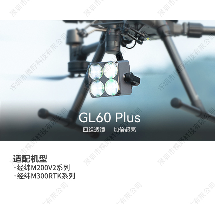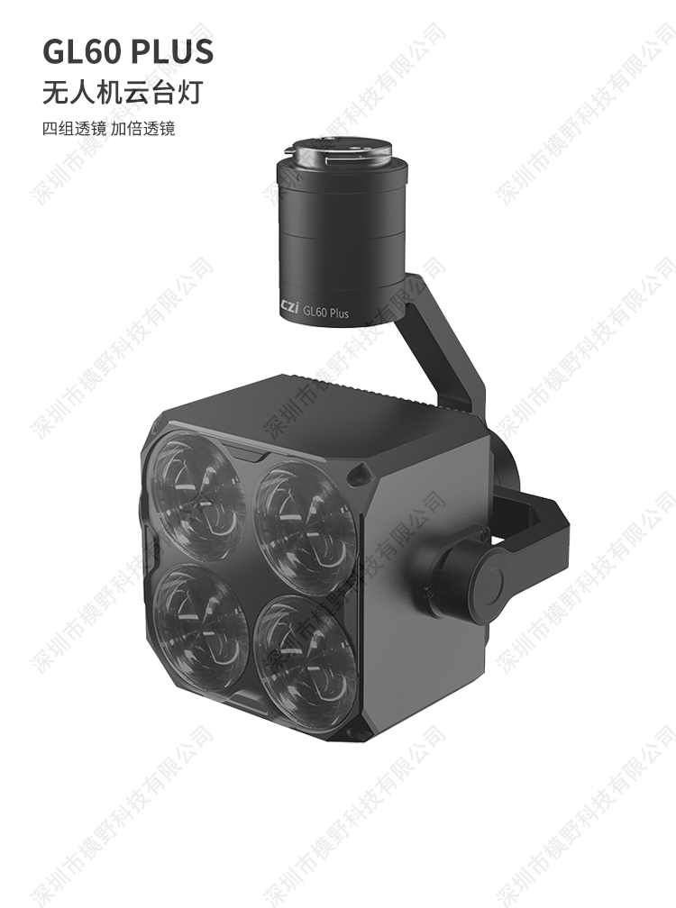 GL60 Plus云台灯,采用4组光学成像组件,每组由4片透镜组合而成,发射出仅15度角的锐利光柱,颜色一致,亮度均匀, 且稳定输出24lux最佳照度,有效照射距离可达150米,有效照明面积1225平方米,将无人机夜间作业的空中照射效果,提升至全新高 度。