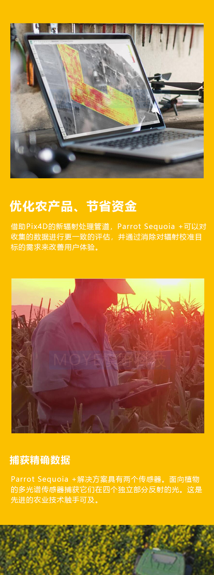精确的数据带来准确的分析、优化您的农产品并节省资金、通过先进技术捕获精确数据、选择与所有无人机兼容的解决方案、充分利用完全自主的传感器
