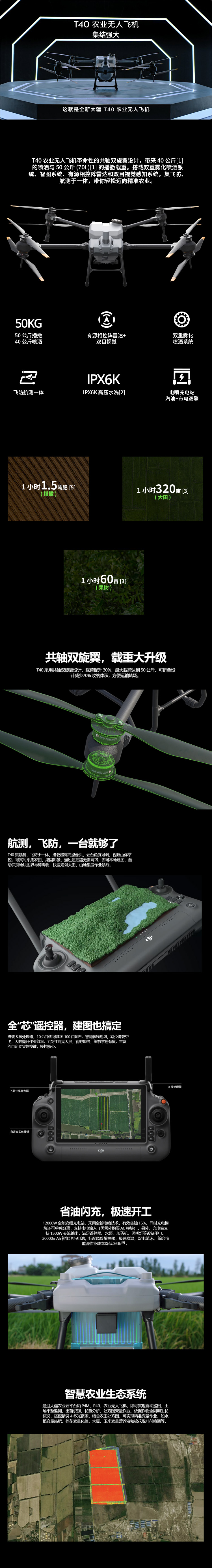 T40 农业无人飞机革命性的共轴双旋翼设计,带来 40 公斤[1]的喷洒与 50 公斤 (70L)[1] 的播撒载重。搭载双重雾化喷洒系统、智图系统、有源相控阵雷达和双目视觉感知系统,集飞防、航测于一体,带你轻松迈向精准农业。