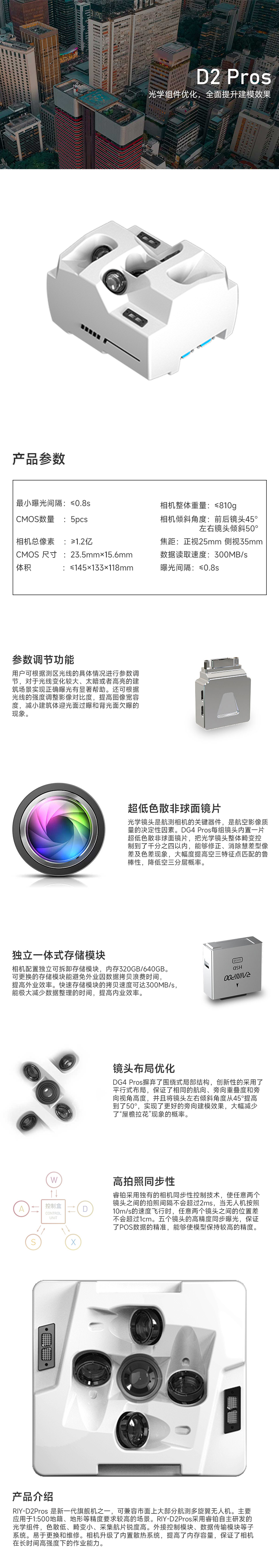 RIY-D2Pros 是新一代旗舰机之一,可兼容市面上大部分航测多旋翼无人机。主要应用于1:500地籍、地形等精度要求较高的场景。RIY-D2Pros采用睿铂自主研发的光学组件,色散低、畸变小、采集航片锐度高。外接控制模块、数据传输模块等子系统。易于更换和维修。相机升级了内置散热系统,提高了内存容量,保证了相机在长时间高强度下的作业能力。