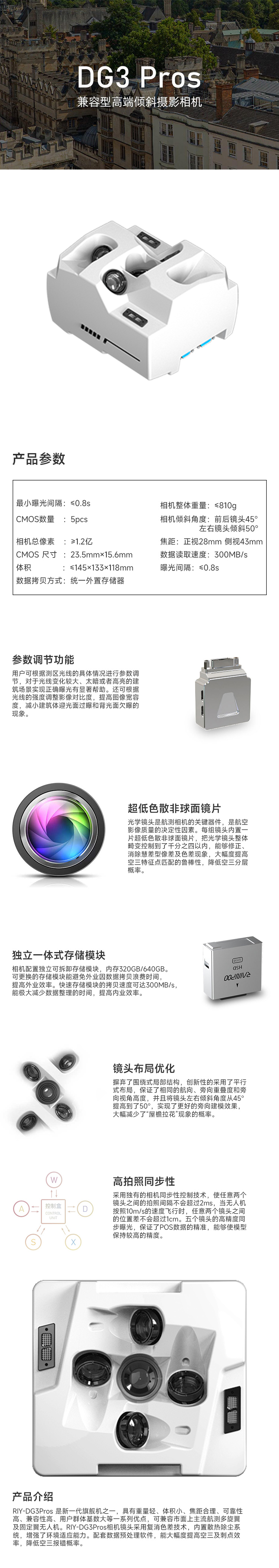 RIY-DG3Pros 是新一代旗舰机之一,具有重量轻、体积小、焦距合理、可靠性高、兼容性高、用户群体基数大等一系列优点,可兼容市面上主流航测多旋翼及固定翼无人机。RIY-DG3Pros相机镜头采用复消色差技术,内置散热除尘系统,增强了环境适应能力。