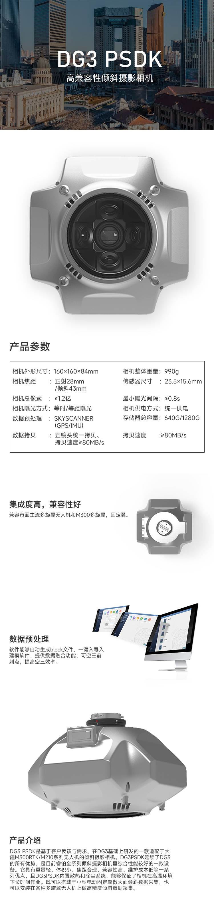 DG3 PSDK是基于客户反馈与需求,在DG3基础上研发的一款适配于大疆M300RTK/M210系列无人机的倾斜摄影相机。DG3PSDK延续了DG3的所有优势,是目前全系列倾斜摄影相机里综合性能较好的一款设备。它具有重量轻、体积小、焦距合理、兼容性高、维护成本低等一系列优点,且DG3PSDK内置散热和除尘系统,能够保证了相机在高温环境下长时间作业。既可以搭载于小型电动固定翼做大面倾斜数据采集,也可以安装在各种多旋翼无人机上做高精度倾斜数据采集。