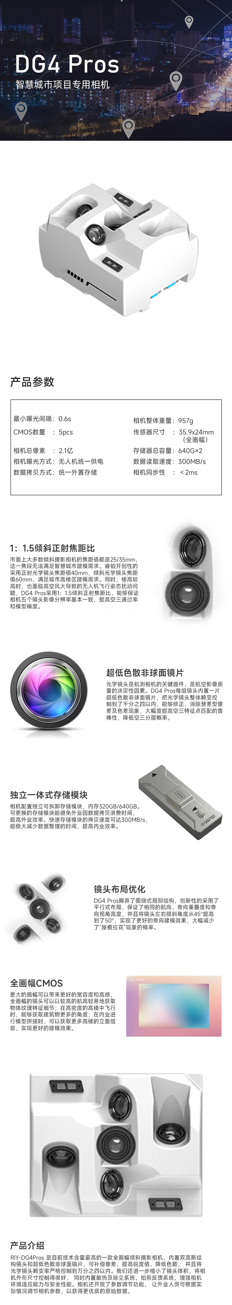 RIY-DG4Pros 是目前技术含量最高的一款全画幅倾斜摄影相机,内置双高斯结构镜头和超低色散非球面镜片,可补偿像差、提高锐度值、降低色散, 并且将光学镜头畸变率严格控制到万分之四以内。我们还进一步缩小了镜头体积,将相机外形尺寸控制得很好, 同时内置散热及除尘系统,拍照反馈系统,增强相机环境适应能力与安全性能。