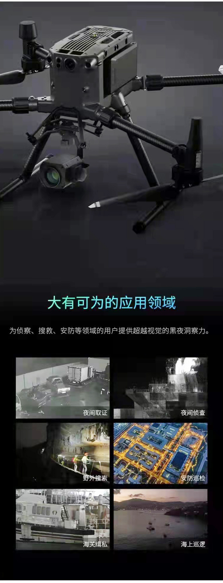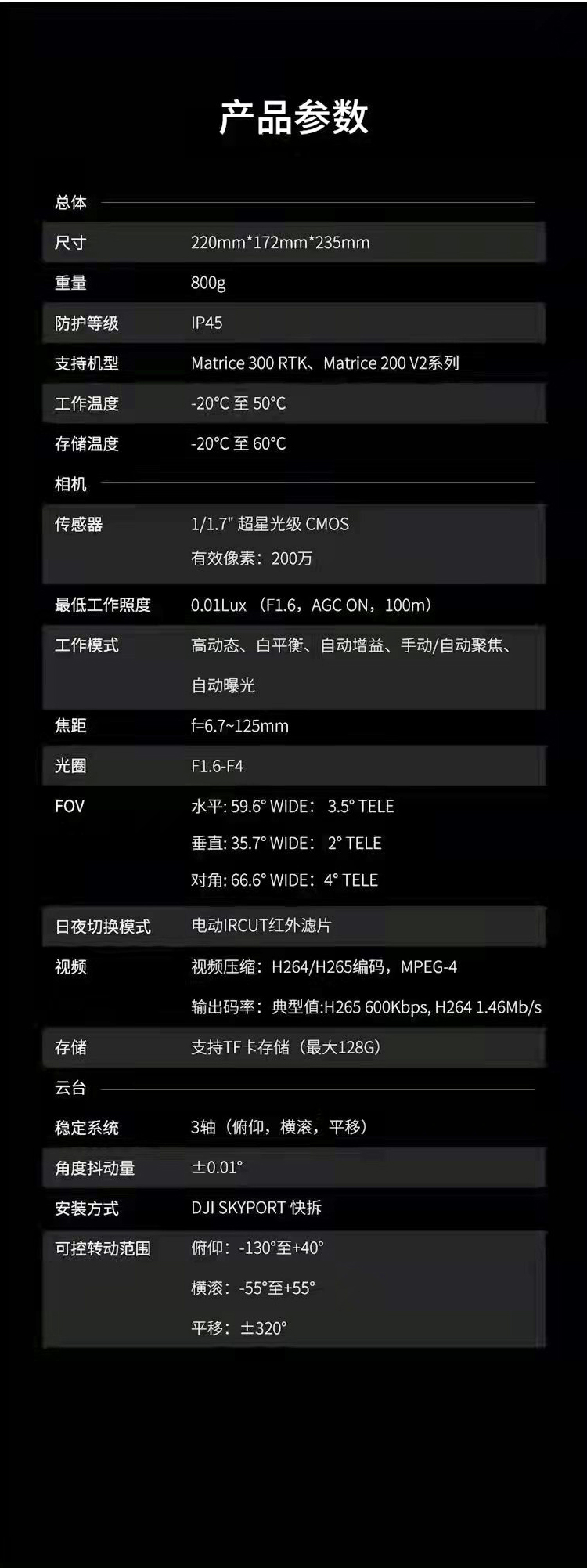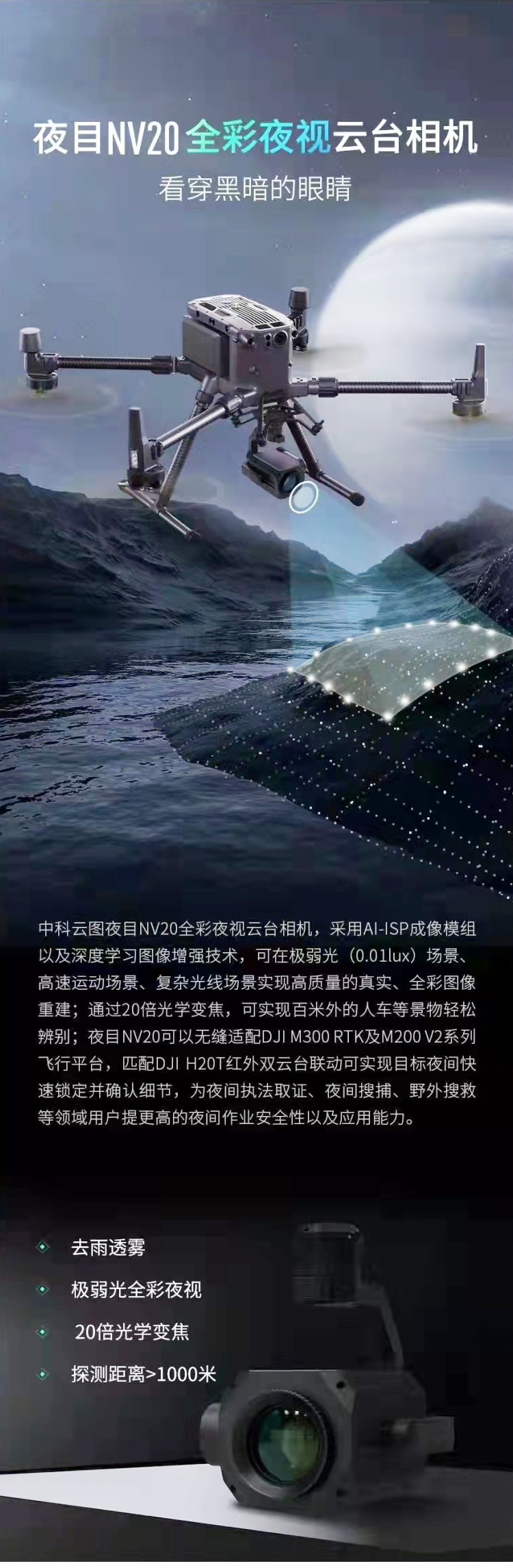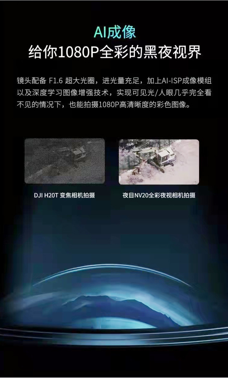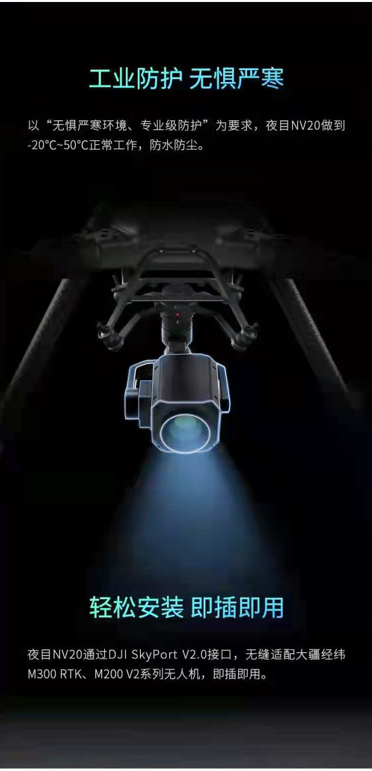 夜目NV20全彩夜视云台相机可在极弱光(0.01lux)场景、高速运动场景、复杂光线场景实现高质量的真实、全彩图像重建;通过20倍光学变焦,可实现百米外的人车等景物轻松辨别;夜目NV20可以无缝适配DJI M30O RTK及M200 V2系列飞行平台