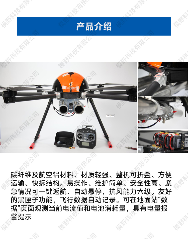 碳纤维及航空铝材料、材质轻强、整机可折叠、方便运输、快拆结构。易操作、维护简单、安全性高、紧急情况可一键返航、自动悬停,抗风能力六级。友好的黑匣子功能,飞行数据自动记录。可在地面站“数据”页面观测当前电流值和电池消耗量,具有电量报警提示
