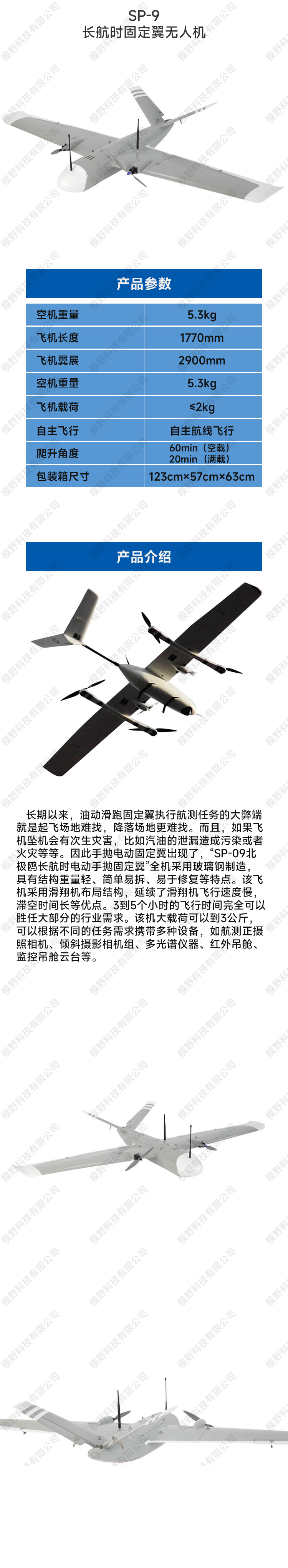 “SP-09北极鸥长航时电动手抛固定翼”全机采用玻璃钢制造,具有结构重量轻、简单易拆、易于修复等特点。该飞机采用滑翔机布局结构,延续了滑翔机飞行速度慢,滞空时间长等优点。3到5个小时的飞行时间完全可以胜任大部分的行业需求。该机大载荷可以到3公斤,可以根据不同的任务需求携带多种设备,如航测正摄照相机、倾斜摄影相机组、多光谱仪器、红外吊舱、监控吊舱云台等。