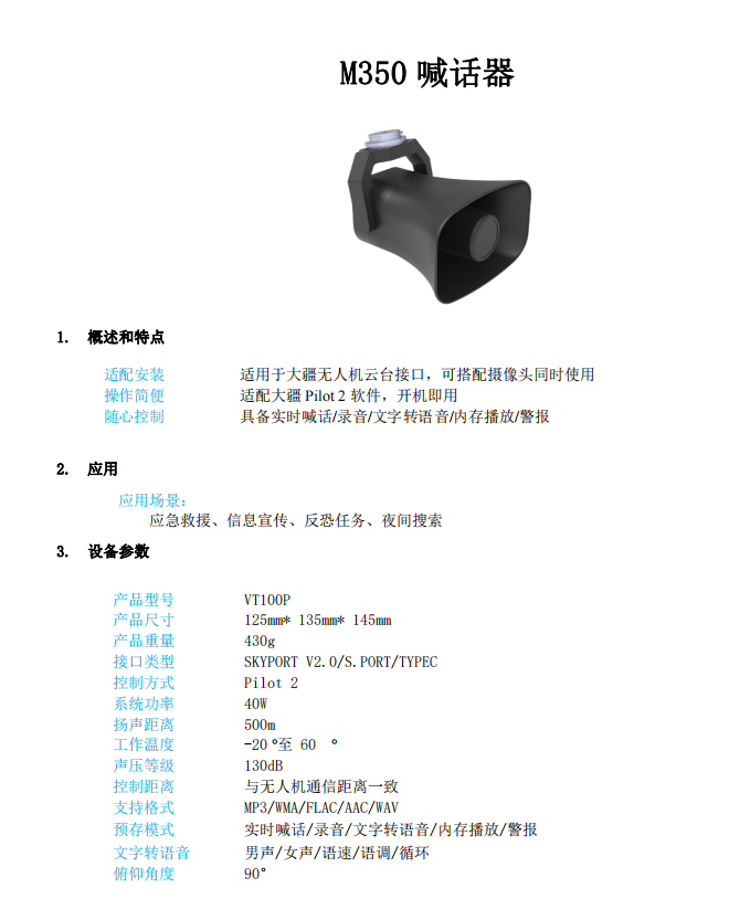 适用于高空救援安防应急巡检预警喊话指挥宣传,搜救追捕交通疏导疫情防控防控警告,130高分贝,430g。多种挂载搭配,可支持定制。