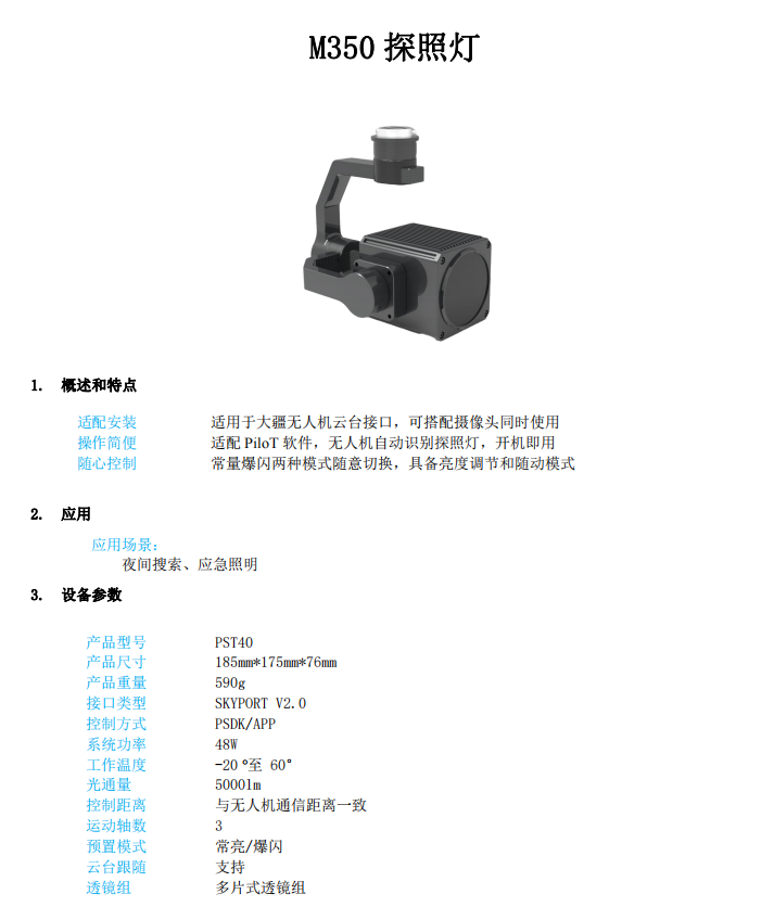 适用安防巡逻辅助预警,消防救援救灾,勘察巡查追捕搜救,空中警力侦察,大功率60W,可调整俯仰角度:-90°~30° 亮度:5000流明,多种挂载搭配,可支持定制。