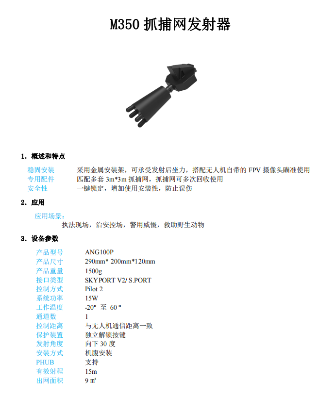 适用抓捕防爆,打击黑飞部队演练,高速飞行至抓捕点进行抓捕行动,网枪面积3.6m*3.6m,有效距离:15m。多种无人机挂载配件搭配,均可支持定制。
