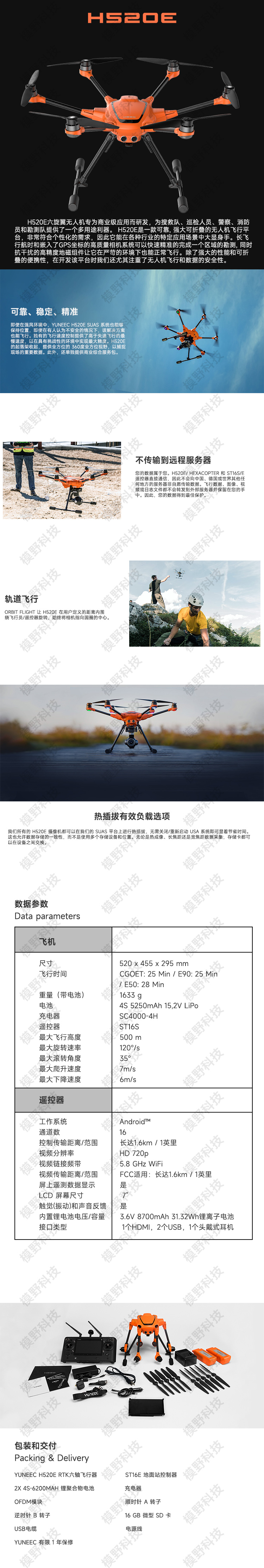 H520E六旋翼无人机专为商业级应用而研发,为搜救队、巡检人员、警察、消防员和勘测队提供了一个多用途利器。 H520E是一款可靠, 强大可折叠的无人机飞行平台,非常符合个性化的需求,因此它能在各种行业的特定应用场景中大显身手。长飞行航时和嵌入了GPS坐标的高质量相机系统可以快速精准的完成一个区域的勘测, 同时抗干扰的高精度地磁组件让它在严苛的环境下也能正常飞行。除了强大的性能和可折叠的便携性,在开发该平台时我们还尤其注重了无人机飞行和数据的安全性。