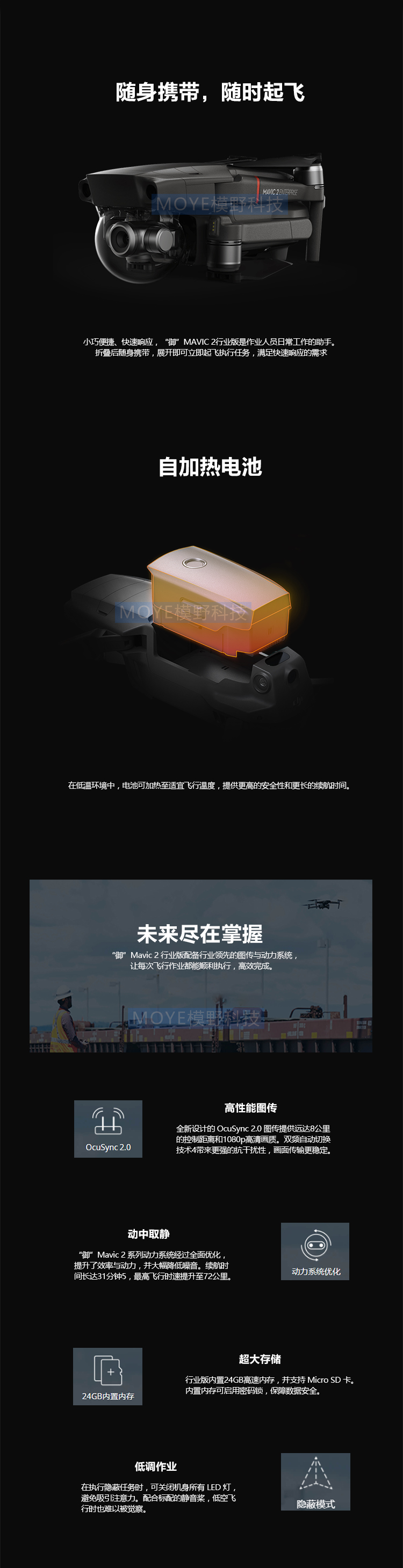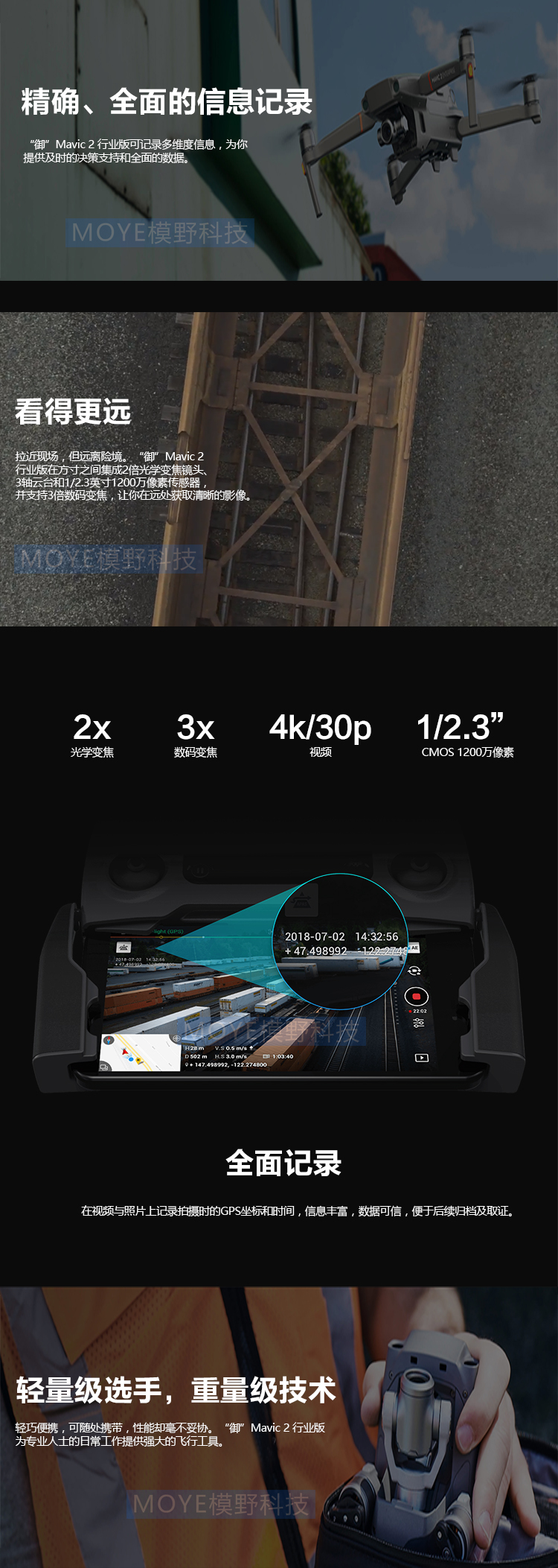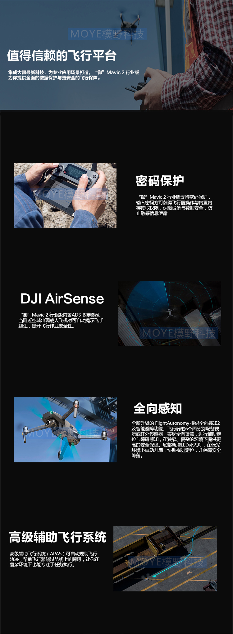 从容应对多种任务、值得信赖的飞行平台、密码保护、DJI AirSense、全向感知、高级辅助飞行系统、精确、全面的信息记录、全面记录、轻量级选手,重量级技术、未来尽在掌握