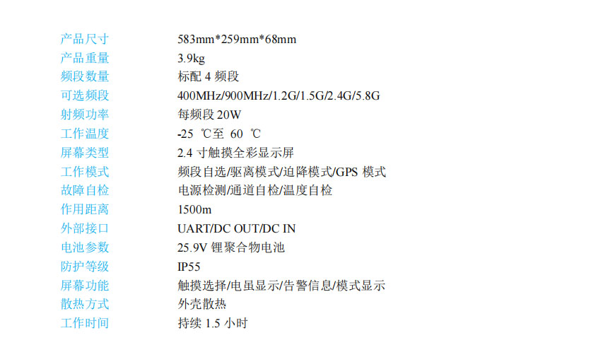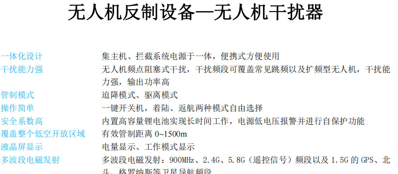 集主机、拦截系统电源于一体,便携式方便使用,无人机频点阻塞式干扰,干扰频段可覆盖常见跳频以及扩频型无人机,干扰能 力强,输出功率高,迫降模式、驱离模式,一键开关机,着陆、返航两种模式自由选择,有效管制距离 0~1500m