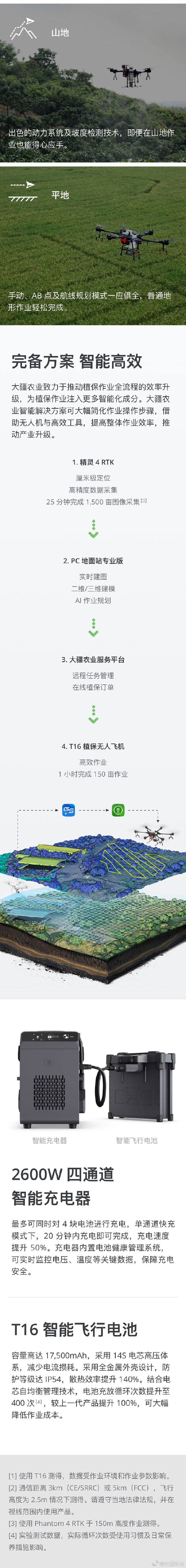 T16 植保无人飞机重塑了整体结构,采用模块化设计,带来了大疆植保无人飞机前所未有的高载重与宽喷幅。强大的硬件协同 AI 智能引擎技术及三维作业规划功能,将植保作业效率提升至新高度。