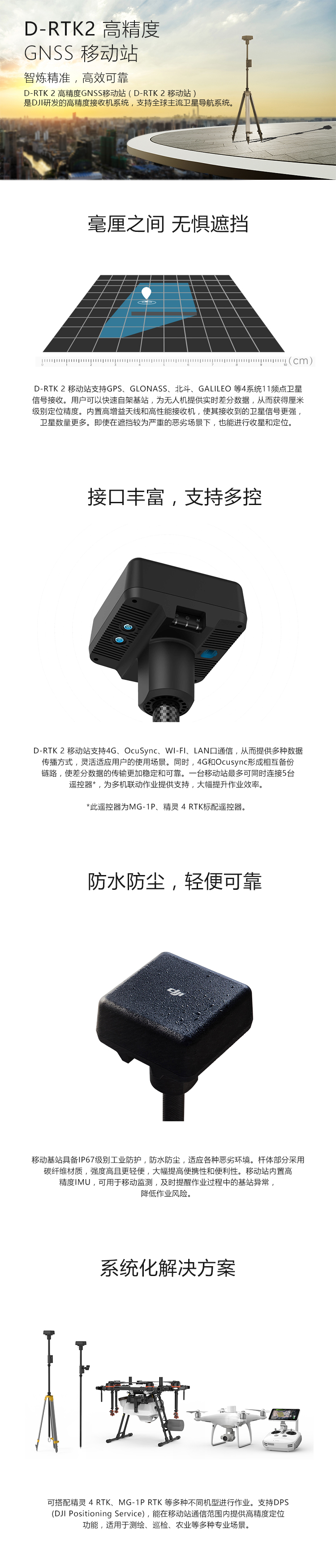 D-RTK 2 高精度GNSS移动站(D-RTK 2 移动站)是DJI研发的高精度接收机系统,支持全球主流卫星导航系统。