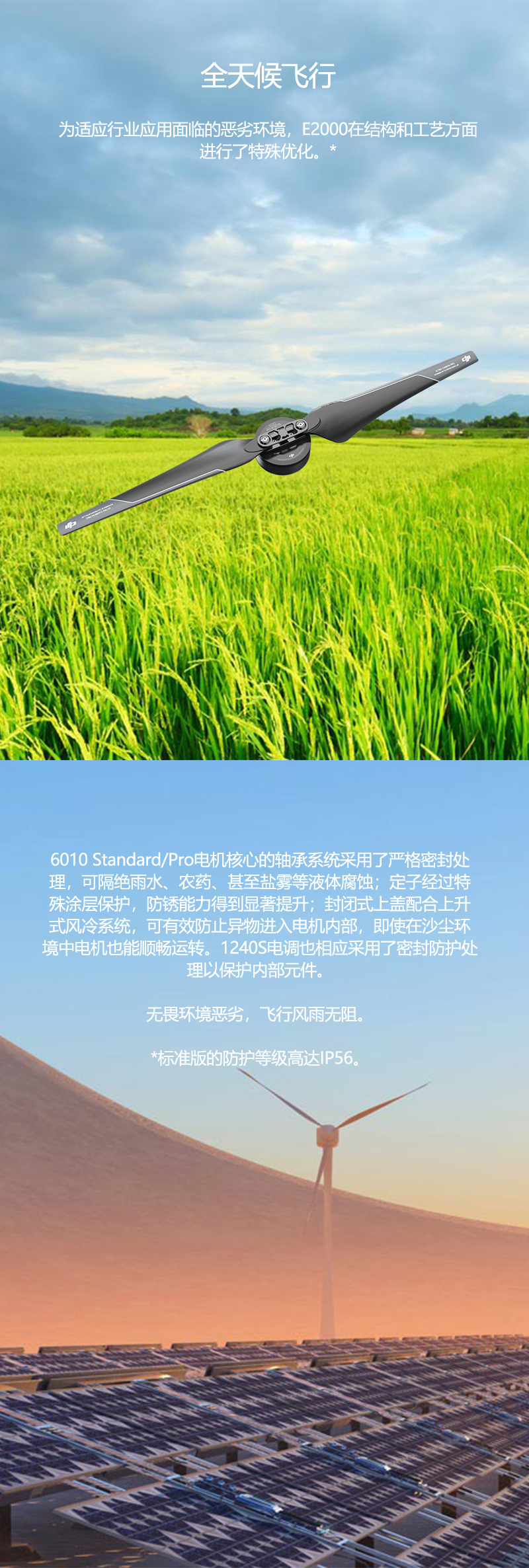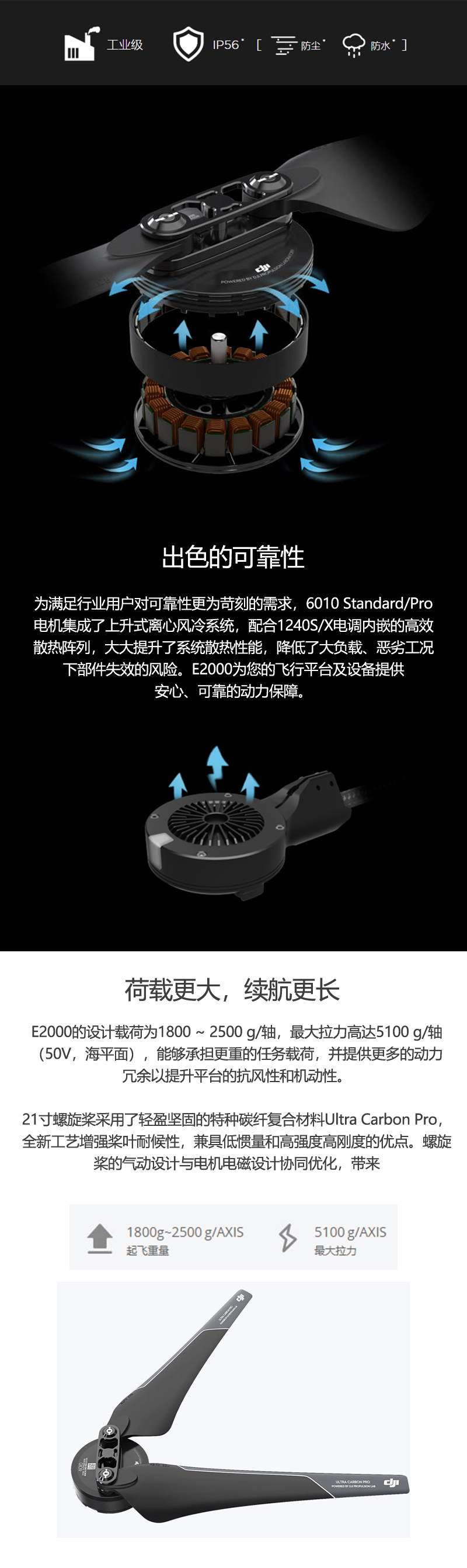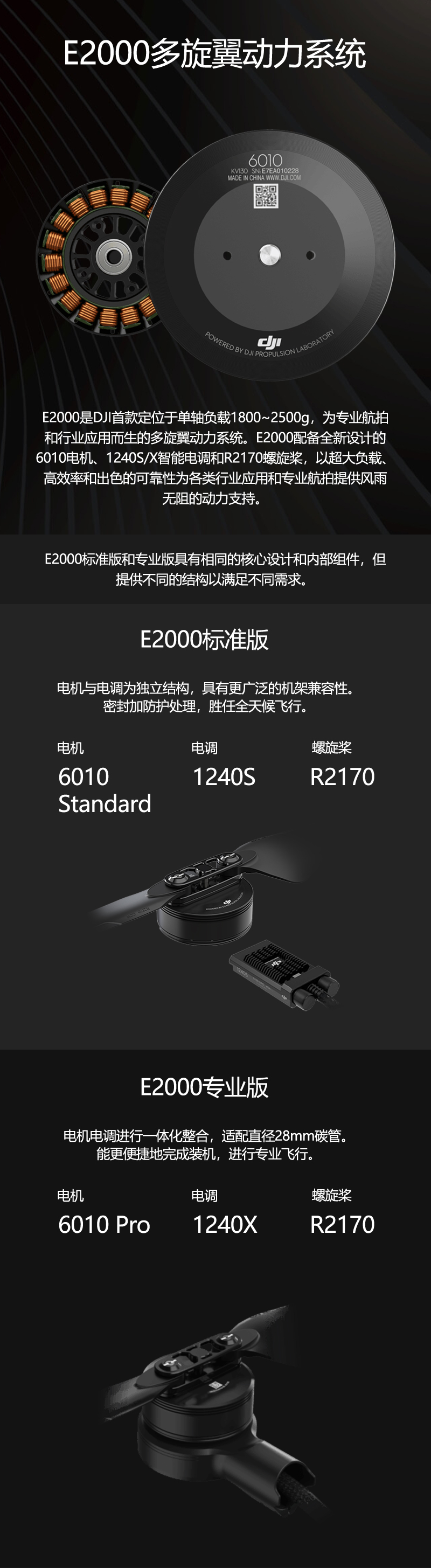 E2000是DJI首款定位于单轴负载1800~2500g,为专业航拍和行业应用而生的多旋翼动力系统。E2000配备全新设计的6010电机、1240S/X智能电调和R2170螺旋桨,以超大负载、高效率和出色的可靠性为各类行业应用和专业航拍提供风雨无阻的动力支持。