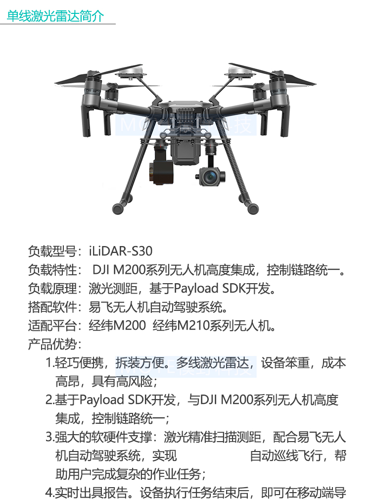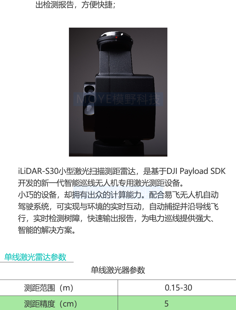 iLiDAR-S30小型激光扫描测距雷达,是基于DJI Payload SDK开发的新一代智能巡线无人机专用激光测距设备。