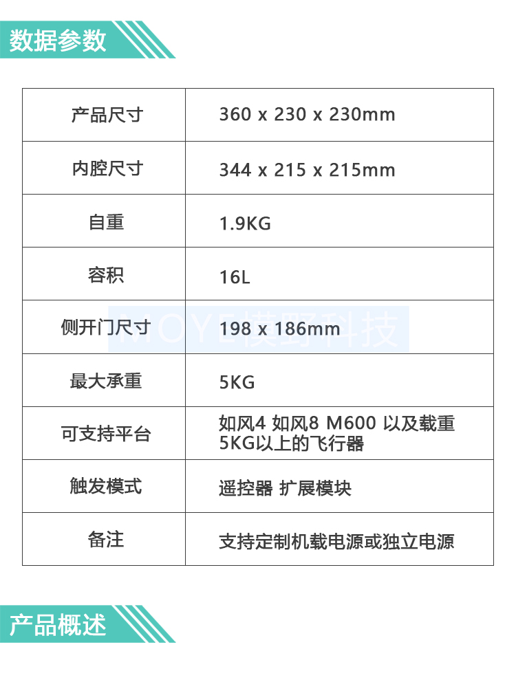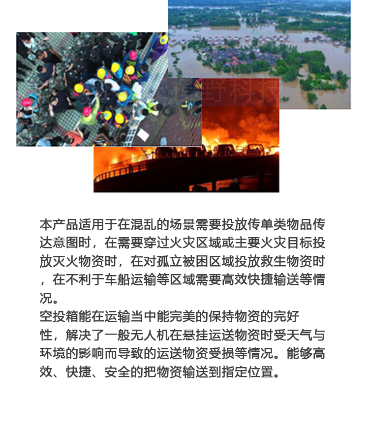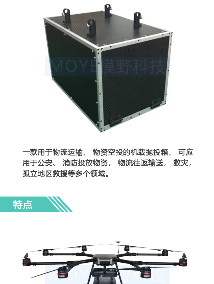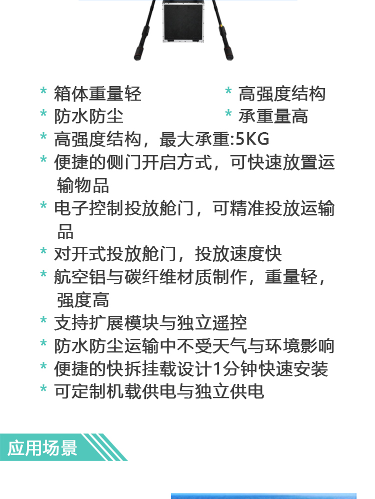 一款用于物流运输、 物资空投的机载抛投箱, 可应用于公安、 消防投放物资, 物流往返输送, 救灾,孤立地区救援等多个领域。