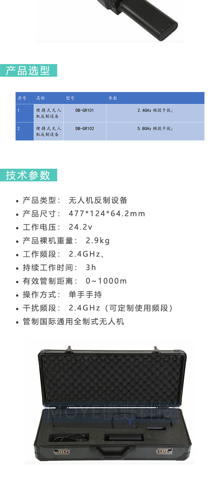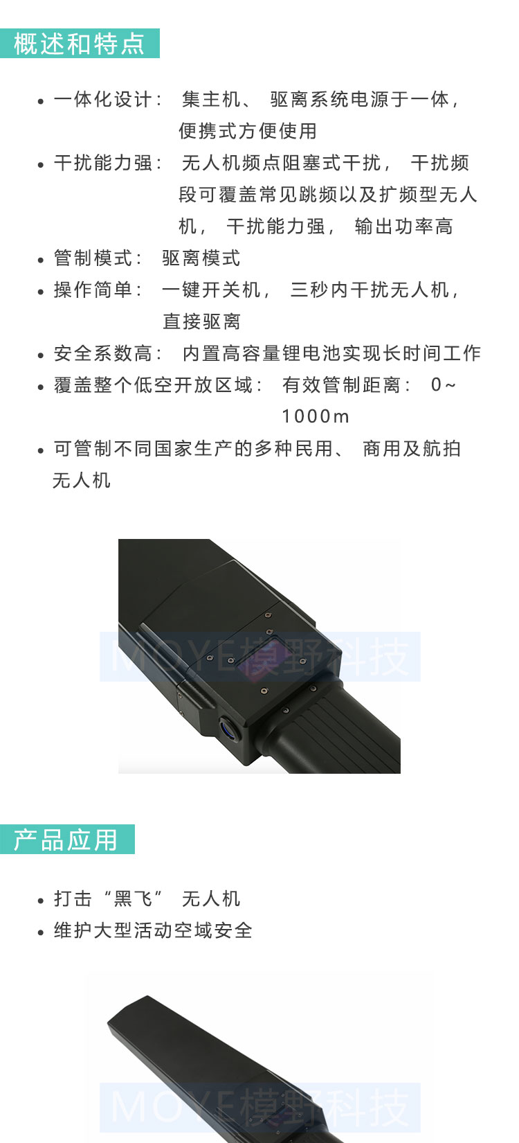 使用电磁干扰的方式, 压制无人机的通讯频段; 同等功率拦截距离更远; 内置天线一体式无需组装,抬手开机即用; 一体式防尘、 防水、 智能散热稳定可靠; 适合外场单兵使用, 快速便捷; 多种频段, 遥控图传信号均可干扰; 强大的威慑作用, 防护低空安全。