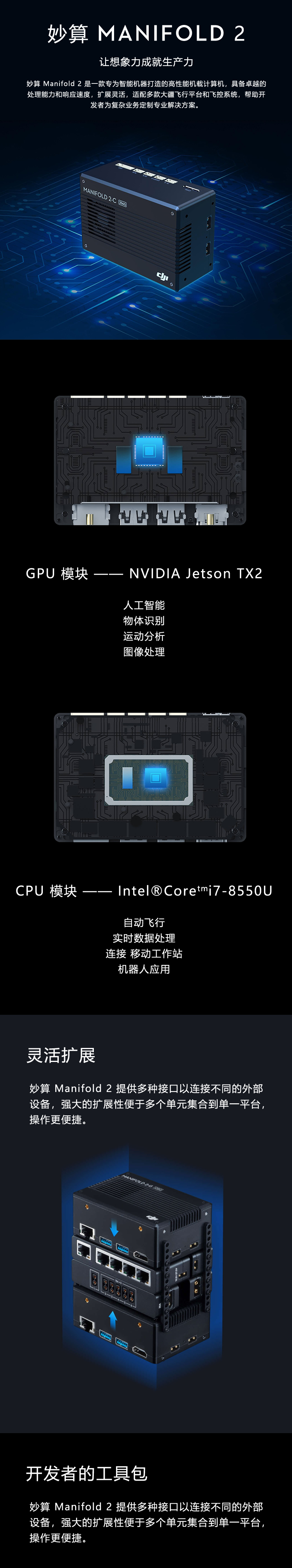妙算 Manifold 2 是一款专为智能机器打造的高性能机载计算机,具备卓越的处理能力和响应速度,扩展灵活,适配多款大疆飞行平台和飞控系统,帮助开发者为复杂业务定制专业解决方案。