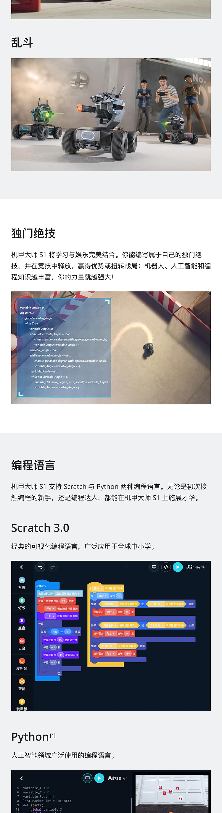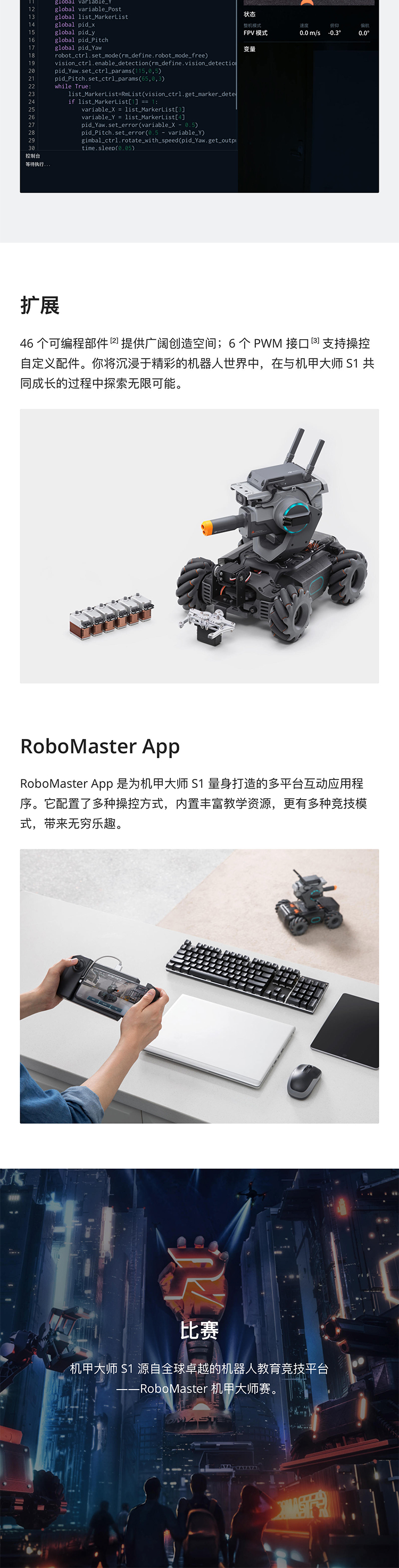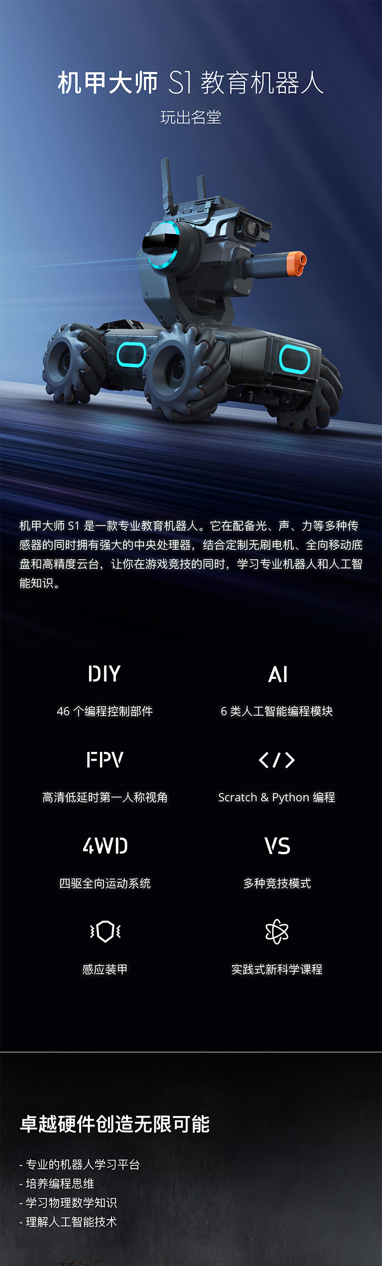 机甲大师 S1 源自享誉全球的机器人教育竞技平台——RoboMaster 机甲大师赛,秉承寓教于乐的设计理念,是 DJI 大疆创新首款教育机器人。你将为它打造独门绝技,在挑战对手的过程中收获知识,超越自我,玩出名堂!