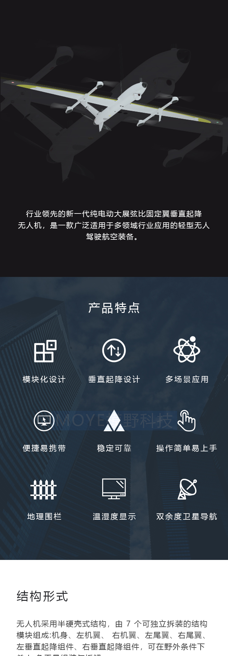 行业领先的新一代纯电动大展弦比固定翼垂直起降无人机,是一款广泛适用于多领域行业应用的轻型无人驾驶航空装备。